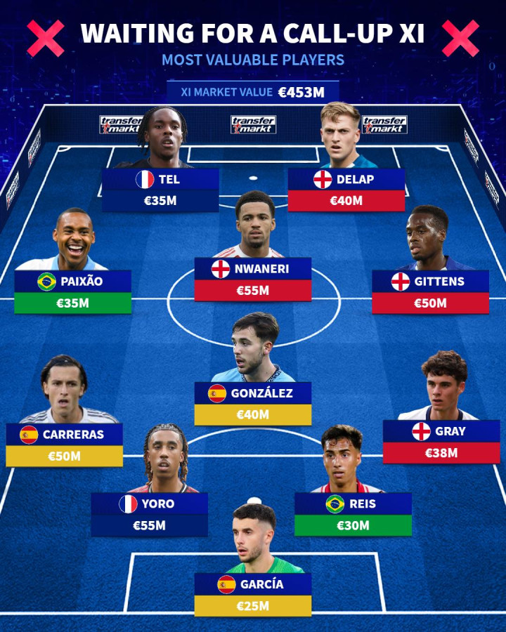 虎扑10月12日讯知名数据网站《转会市场》(Transfermarkt)评选出了“等待国家队征召的最具身价11人阵容”,这套由年轻新星组成的虚拟阵容总身价高达4.53亿欧元。